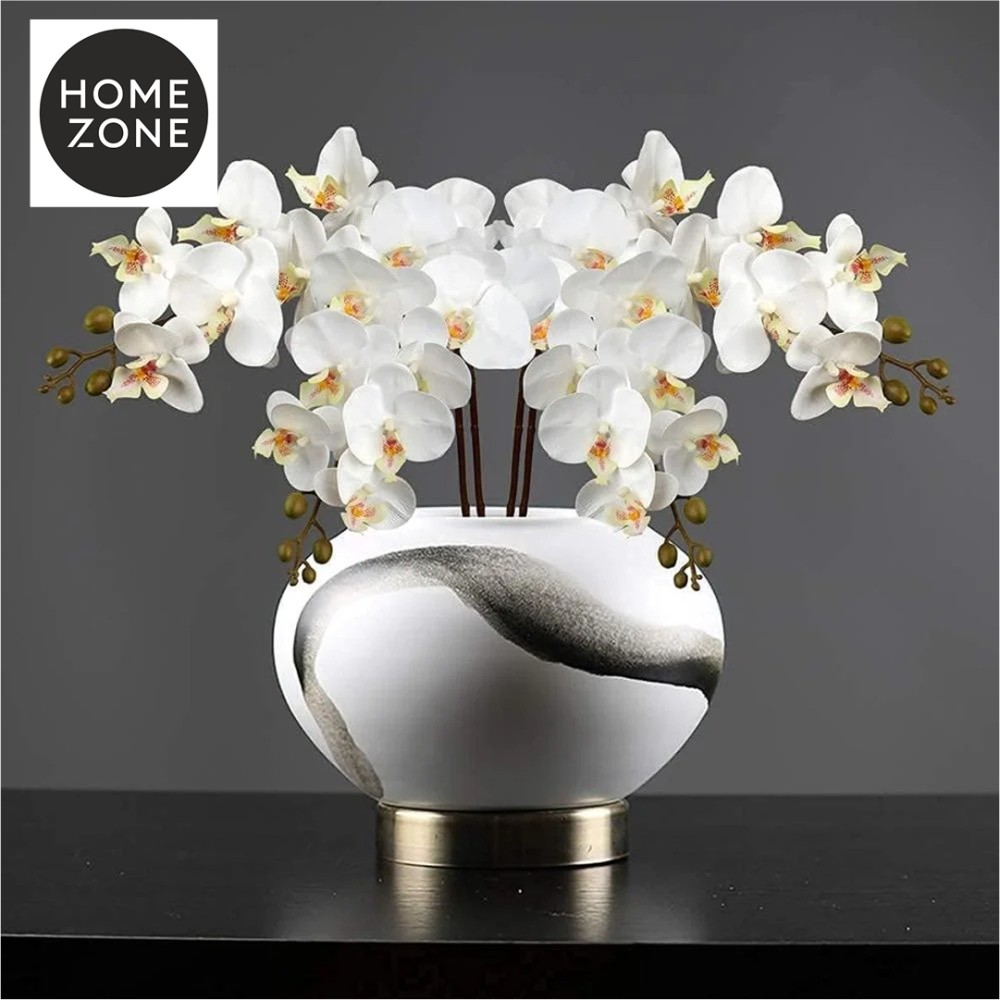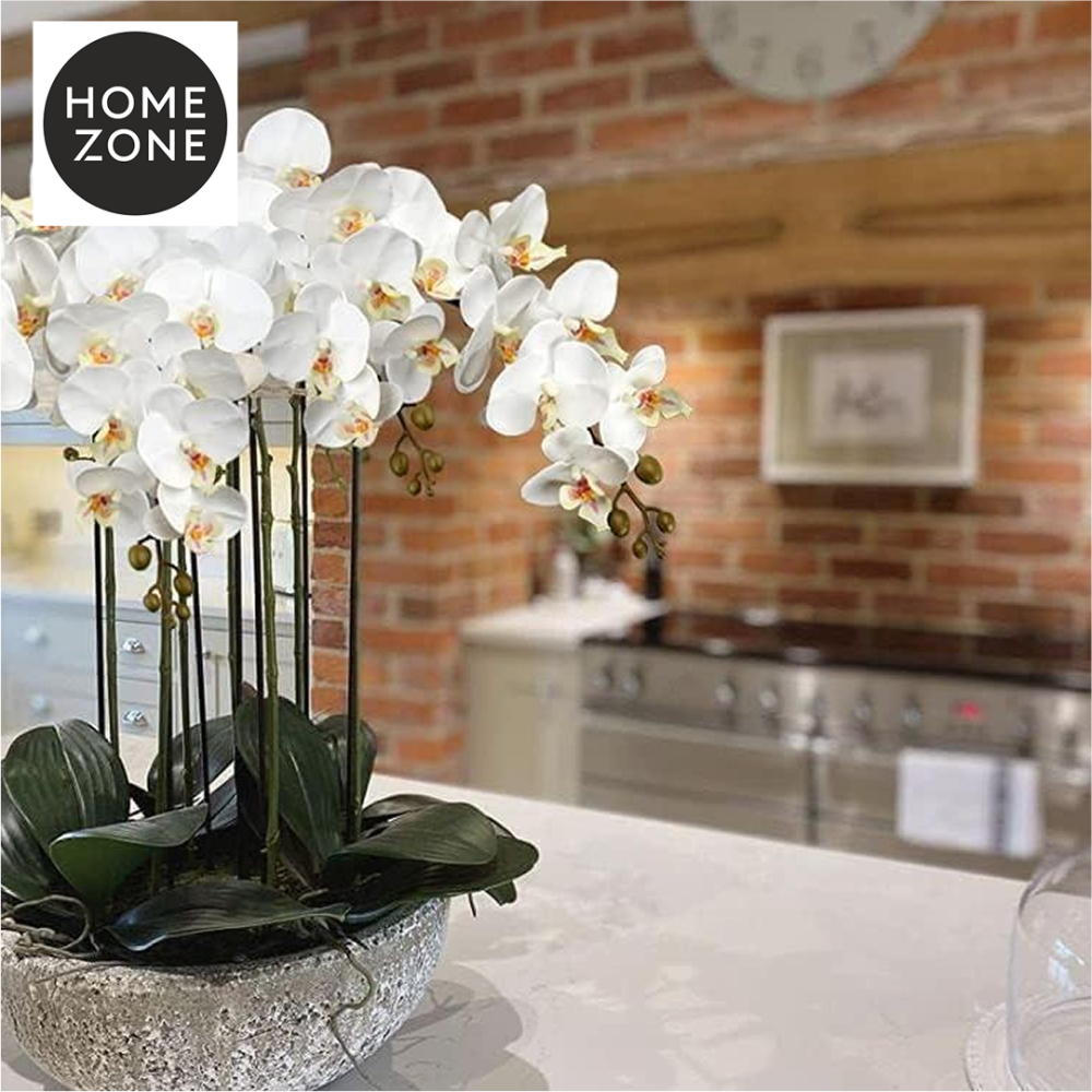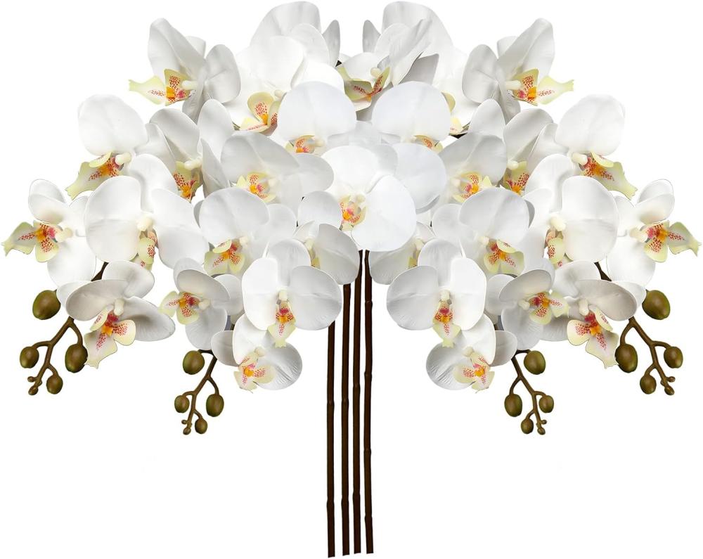 - The faux orchids stretch to a substantial 34.6 inches featuring a stack of full 3.2 inch blooms. Each flower can be positioned to perfection because the stems are detailed with wire.
